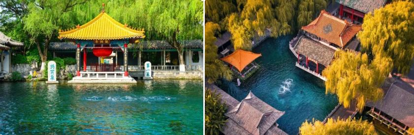 【“天下第一泉”之趵突泉】位于济南“七十二名泉”之首,至今已有 2000 多年的历史。 它也曾多次出现在文学作品中,有代表性的则是老舍笔下的《趵突泉》。而游客来此都是为了一睹趵突泉三股泉水喷发的壮丽景象。澄澈清洌 ,昼夜喷涌,水盛时高达数尺。除了泉水,公园内还有一处值得观看的景致就是公园的南大门,它布置得富丽堂皇、雍容华贵,大门上的横匾“趵突泉”蓝底金字,是清朝乾隆皇帝的御笔,被人誉为中国园林“第一门”。